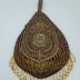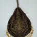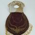 A purple velvet Ottoman teardrop bag embroidered with gold thread and gold sequins, the flap and hem are fringed with gold-tone seed beads and bugles loops, has a loop handle and a mirror in the lid.