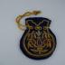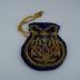 Ottoman-style drawstring purse bag in blue velvet with red velvet appliqué and gold and silver metallic thread embroidery, closed with yellow silk cord.