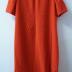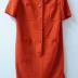 A sheath, short-sleeved mini dress made of "Valentino red" woolen crepon, collarless, with padded shoulders, fastened at the front with six red plastic buttons, has four rounded button fastened patch pockets – two on the chest, two on the hips, lined with burgundy viscose silk.