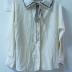 A white crepe de chine marine-style blouse features a sailor collar trimmed with grey stripes by the outline and a bow ties at the neck, long sleeves with two-button cuffs and a front placket with a hidden fastening.