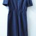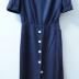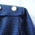 A day dress in fine navy blue wool with white dots, featuring short sleeves with turn-ups and shoulder pads, a sailor collar imitation, secured on the shoulders with two white plastic buttons on each, slanted pockets at front of a waist-cut skirt, and a deep rear vent fastened with six white plastic buttons.