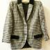 A lady's jacket in grey-blue plaid wool flannel trimmed with black velvet; single-breasted with rounded foreparts, fastens with two black plastic buttons and has three more on the sleeve vents, gathered unted the rear yoke, has a shawl collar half covered with velvet, and two welt pockets with velvet flaps. From the House of Valentino "Miss V." collection.