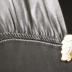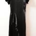 A black silk satin short-sleeved cocktail dress in the Mussolini style, embellished with two silver leaf-shaped clips with rhinestones; has a square neckline; and padded shoulders, that are gathered by the yoke line; a waist-cut midi skirt adorned with an asymmetrical flounce; closed with a metal zipper in the left seam.