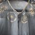 Black chiffon Mussolini-style open tunic with short one-piece sleeves, a signature gold Marino FORTUNY handprint around the neckline and a single hook-and-eye closure.