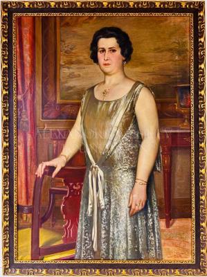 A portrait of a dark-haired woman with a bob haircut wearing a Charleston evening gown of silver guipure overlaid a gold lamé sheath dress, trimmed with a silk satin ribbon tied in a bow at the chest. She wears rings with large stones and thin gold bracelets on both hands, earrings with large stones, and a filigree gold pendant with a chain on her neck. The portrait was made in an interior with red curtains and Chinese red lacquer furniture.