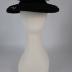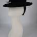 A black felt Spanish-style hat with a flat crown, decorated with a felt bow at the front, and a medium-wide brim, trimmed along the edge with black soutache loops, hold in place with wide silk ribbons under the hairdo, which connected with an elastic band.