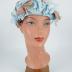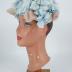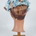 A sky blue silk satin flower hat completely covered with blue and beige silk muslin flowers, has a blue grosgrain Petersham ribbon and a blue faille lining.