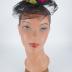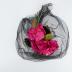 A fascinator with a black veil attached to a bouquet of scarlet taffeta roses with green and black velvet leaves.