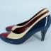 A pair of pumps feature a distinctive color-blocking design in navy blue patent leather quarters and heel covering, red toe patent leather caps, and ivory chevreau topline of the vamps, have 7 cm high cone heels and red chevreau lining.