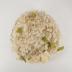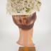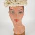 A white crin pillbox hat topped with chiffon orange blossom flowers with white artificial stamens and green silk leaves; the outline reinforced with wire and edged with sage-colored velour ribbon with a rear bow of ivory velour ribbon.