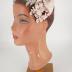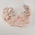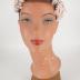 A percher half-hat woven from pale pink chenille wire, adorned with two rear pale pink silk velour bows and topped with pale pink silk orange blossom flowers with pearl cores and stamens, with two groups of chrysanthemum petals embroidered with pale pink gelatin sequins and silver glass beads, which framed the face.