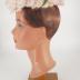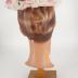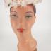 A pale pink sisal pillbox hat topped with white and pale pink organza flowers with bright silk velour flowers with green leaves by the edge, which reinforced with wire and binded with pink velour; the hat has pink grosgrain sweatband.
