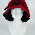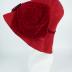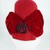 An oversized reversible red felt cloche hat with black internal side, adorned with a thin tone-on-tone velvet ribbon and a giant scarlet silk velvet bow with black silk satin lining and a scarlet and black rose in its center.