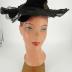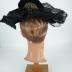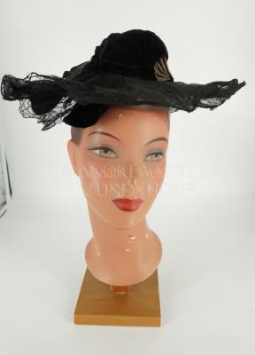 Edwardian teens black horsehair hat with black pleated lace wired brim and a collapsed black silk velour wired crown, trimmed with golden brocade braid, adorned with a rear black silk satin bow with a scarlet silk satin rose in its center. Meant to be worn atop the head as the head hole is very small.