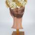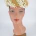 A lemon-colored sinamay mesh pillbox hat with a puffed brim, decorated atop with spiral-twisted golden sisal woven ribbons with white silk lily-of-the-valley flowers between them, has a lemon-colored organza sweatband and tone-on-tone tulle lining.