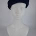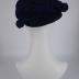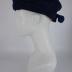 Soft navy blue crochet beret knitted in diagonal ribs with turn-up, that is rear tied into a bow with two pompoms on the ends, lined with black cotton.