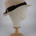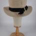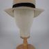 A cream melusine felt mens’ Derby hat with a flat crown top and a platter brim, decorated with a black grosgrain ribbon threaded through a felt loop at the base of the crown, lined with cream viscose silk.
