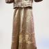 A two-piece silk satin ball gown in dry rose color with pleated sleeves and a pale pink chiffon pintucked yoke, trimmed with ivory Alençon lace. The boned bodice with a wide ceinture has a pale pink chiffon yoke with pintucks and ruffles by the edge of the square neck, it's adorned with horizontal midriff pleats, and held on the shoulders with the straps decorated with silk flowers in a matching color; its short puff sleeves made of pleated silk satin without cuffs are trimmed with ivory machine lace strips in the middle and connected to the bodice by the armhole bottoms; a flared floor-length skirt is decorated with Alençon lace appliqués in the middle and a thin ruffle by the hem, it has a small rear train.