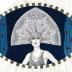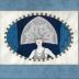 Cardboard drawing of an Art Deco styled female figure wearing a stylised kokoshnik. The entire image is framed within an oval medallion, its border detailed with small gilded squares. The composition depicts a woman standing en face, engaging the viewer with a luminous smile and serene expression. Her hair, rendered in shades of red, is styled in a classic 1920s coiffure, softly framing her face with a few strands gently falling forward. Her head is adorned with a monumental silver kokoshnik, crafted from metallic silver fabric and richly embellished with cabochons in white, pale blue, and deep red. The kokoshnik is structured with a radiating fan-like silhouette, punctuated with geometric and floral motifs formed from sequins and beads, creating a shimmering, textured surface that captures the light and emphasizes the headdress’s theatrical quality. The lady wears a matching silver dress, decorated with sinuous silver and muted brown curvilinear patterns. Around her neck, she wears a double strand of light blue beaded necklace. The background consists of a dark blue oval field, flanked on either side by lighter blue panels adorned with vertical stripes, each punctuated by small dark red circular motifs.