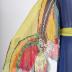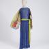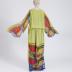 Muslin butterfly print evening dress. Two-tone, made of blue chiffon at front and double light green chiffon at back, with a slouched top, a small oval neckline, a train with a double butterfly print at the hem - the top layer is shorter, so that two butterflies are visible one above the other, with long flyaway sleeves with a butterfly print on each half of them – all the "butterflies" are cut out along the wings edges. The light green part of the dress is sewn by the sides and gathered with an elastic band, a long green chiffon sash is attached to the back and in the side seams.