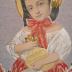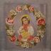 Beaded embroidery of a girl with a flower basket. A young girl in a white blouse and a red skirt, wears a summer straw hat and a basket with the lilies of the valley. Venetian beads, silk thread, and a coloured lithography.