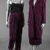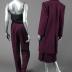 A three-piece Dior Haute Couture AW 1984 ensemble: an aubergine-colored topcoat with trousers and a skirt. The wool flannel coat is single-breasted and fastened with one large purple plastic button, with the same smaller ones at each sleeve vent, has narrow notch lapels, two welt pockets at the hips and one at the chest, a deep rear vent, and a purple silk lining. A midi length aubergine wool crepe pencil skirt has a narrow waistband, four darts, rear zip closure and a vent, lined with purple silk satin. The wool crepe tapered to the ankles trousers have a narrow waistband with two pleats on each side of the center front zip.