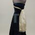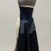 A navy silk satin bustier Couture cocktail dress with a two-tone ivory and navy silk satin fringed scarf; it features a strapless bustier bodice with a left zip closure and a gently flared skirt that of just below the knee length; an asymmetrical silk satin lapel runs along the rear topline of the bustier, passes to the front, sloping from the right armpit to the left seam, is threaded with a drapery through a large loop attached at the left side of the waistline, and falls as a two-tone scarf with the ivory silk side out, and the lower navy half reaching the hem of the dress; the dress is lined with ivory faille.