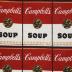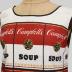 Andy Warhol's painting "Campbell's Soup Cans" print repeated horizontally on white background and trimmed with black bias.