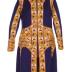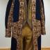 Livery footman, who accompanied on the hunt of the Polish prince, suit: wool flannel coat, knee breeches & waistcoat. Navy coat heavily embellished with woven cut and uncut wide velvet trim with heraldic coats of arms of the Polish king (insignia of lion and eagle), the hat of the Catholic Cardinal from the Vatican, and even the hog that the prince had hunted. Coat with banana wool facings back lined in homespun linen. Mustard breeches, waistcoat with metallic braid, drop front breeches, and waistcoat with linen back.