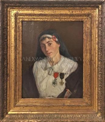 Painting portrait of Germaine PERSEM, a nurse at the temporary military hospital N° 30 during the World War I, who was rewarded a Knight at the Legion of Honour.