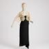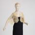 Tea dress with straps, decorated with machine laces and velvet bow on the hips; with scalloped machine laces bolero, flyaway sleeves with a slit along the bottom seam, embroidery on tulle in the style of Valenciennes lace.