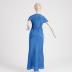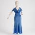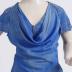 Blue dry silk dress with cowl-neck overlaid a bodice; the bodice is lined with white cotton and beaded in a lane at the center front, the bias-cut skirt with X-shaped undercut at the midriff, the flutter sleeves are embroidered with beads and silk thread in a vermicular pattern.