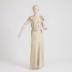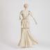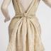 Gold lamé dress with double-folded wings on the shoulders, cut-off bodice with a slight overlap at front, draped in the side seams, a deep rear V-neck to the waist with a complex system of darts on the rear skirt and the folds from them; a separate sash, fastened with buttons, with a large bow at the rear waist.