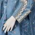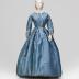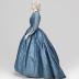 Afternoon dress in blue-gray taffeta with cream and red florets; closed round neck bodice with embossed metal buttons. Skirt on plunging crinoline with hollow folds.