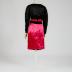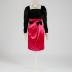 Satin viscose cocktail dress in black and raspberry with the square neckline on the draped bust, long raglan sleeves to the same with zippers at the bottom, waist adorned with a black velvet belt adorned with a bow, and a raspberry cupro rayon satin bud skirt; lined with black acetate silk.