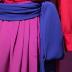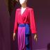 Cocktail wrap dress made of contrast-coloured silk. Waistline is adorned with a cerulean silk belt.