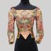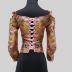 Silk brocade floral Caraco in the Rococo style. Made of figured salmon polychrome silk and metallic silver floral brocade. Front and sleeve lacing, lined in cream silk.