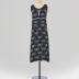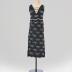 Evening dress in black colour silk and chiffon embroidered with transparent silver glass beads forming repeating flowers, decorated with a tassel on the chest and three beaded horizontal lines on the back.