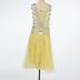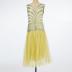 Evening dress in yellow colour tulle embroidered on the top with silver and ivory colour glass beads of different sizes forming Art Deco ornament.