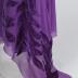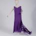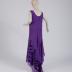 Violet silk chiffon dress with velvet application. Probably haute couture, Paris (lable missing). Evening dress in flapper style made of double-layered violet chiffon, sleeveless, with a wide round neckline, asymmetrical wave-shaped reliefs at front and back with asymmetrically directed groups of pintucks between them in the hip area, the underdress is reinforced with a wide strip of non-woven fabric by hem, on the skirt of the overdress there are fly-off gores overlapping each other, the rear gore from the left seam forms a train and is decorated with a violet velour plant appliqué, the gore on the right side without appliqué.