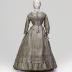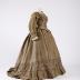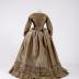 Greige silk taffeta dress of colour calle "Paris dust" consisting of a bodice and a skirt. Bodice is decorated with 8 macrame trimmed buttons and white lace collar. Bodice and skirt are adorned by ruffles.