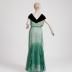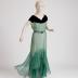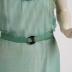 Transparent emerald green crinkled chiffon dress, sleeveless, with black cotton velvet turn-down collar, overlaid dropped shoulders, ruffles on the skirt and a belt of the same emerald-green color with black covered buckle. Jade-green silk slip.