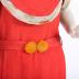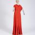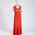 Rust-colored textured silk dress with Art-Deco style trimming in ivory silk brocade printed with daisies, lilies of the valley and roses. The dress has short raglan sleeves, trimmed with brocade cuffs, the neckline and a fly-away yoke bordered with brocade (the yoke edge repeats the shape of the neckline), the rear neck is raised and flows into the shoulders, connecting at front with a silk crosspiece, intercepted in the middle. The slightly flared skirt has large zigzag sewn-on gores in the lower third, forming a godet shape. Goes with the same fabric belt with two bakelite shell-shaped buckles.