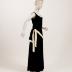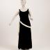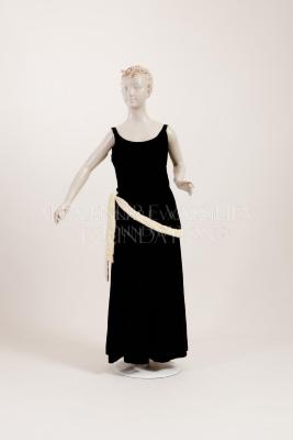 A Germaine Lecomte couture black panne-velvet evening gown from early 1930s. The peplum with side ties to the waist is edged with hermine fur, godets to give flare to the hem.