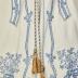 White knee length cape with dark blue embroidery in fanciful pattern, peaked hood with tassels.