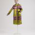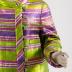 Summer coat in neon green lamé with violet, fuchsia and silver stripes, horizontal welt pockets with flaps at the front; the band-collar, side seams, front placket, hem and sleeves binded with bias-cut lamé, 7-button fastening in white metal with green rhinestones and loops, lining in champagne satin with logos "Lawrence of London".