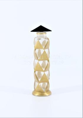 Pressed-molded glass perfume bottle in cylindrical shape decorated with faceted triangles partly enamelled in golden color. A black bakelite cap, depicting a stylized cocked hat, completes the bottle.