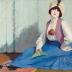Woman in Oriental style, wearing a turban with an egret and holding a fan, poses sitting on the ground.