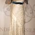 Silk evening dress with embroidery on the collar, black tulle sleeves and blue velvet belt.