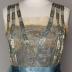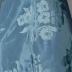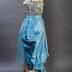 Sleeveless evening dress in blue twill silk with woven bouquets of flowers. The bodice is made in a golden machine lace with criss crossing pearl bands ending in group of three bands on each shoulder strap.
